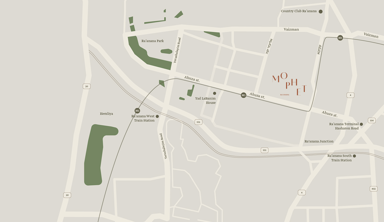 Mophet Ra’anana is located in the city center of Ra’anana, just 20 minutes from Tel Aviv. With excellent highway access and the upcoming Metro Line M1, getting home is always a short and comfortable journey.